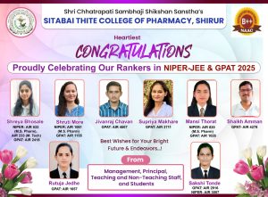 श्री छत्रपती संभाजी शिक्षण संस्थेच्या सिताबाई थिटे कॉलेज ऑफ फार्मसी, शिरूर येथील विद्यार्थ्यांनी यंदाच्या GPAT (Graduate Pharmacy Aptitude Test) आणि NIPER-JEE 2025 (National Institute of Pharmaceutical Education and Research Joint Entrance Examination) या राष्ट्रीय स्तरावरील अत्यंत प्रतिष्ठेच्या परीक्षांमध्ये उल्लेखनीय यश संपादन केले आहे. या यशस्वी कामगिरीमुळे संस्थेचे नाव उज्ज्वल झाले असून, विद्यार्थ्यांनी आपल्या मेहनतीने आणि चिकाटीने अभिमानास्पद स्थान मिळवले आहे.